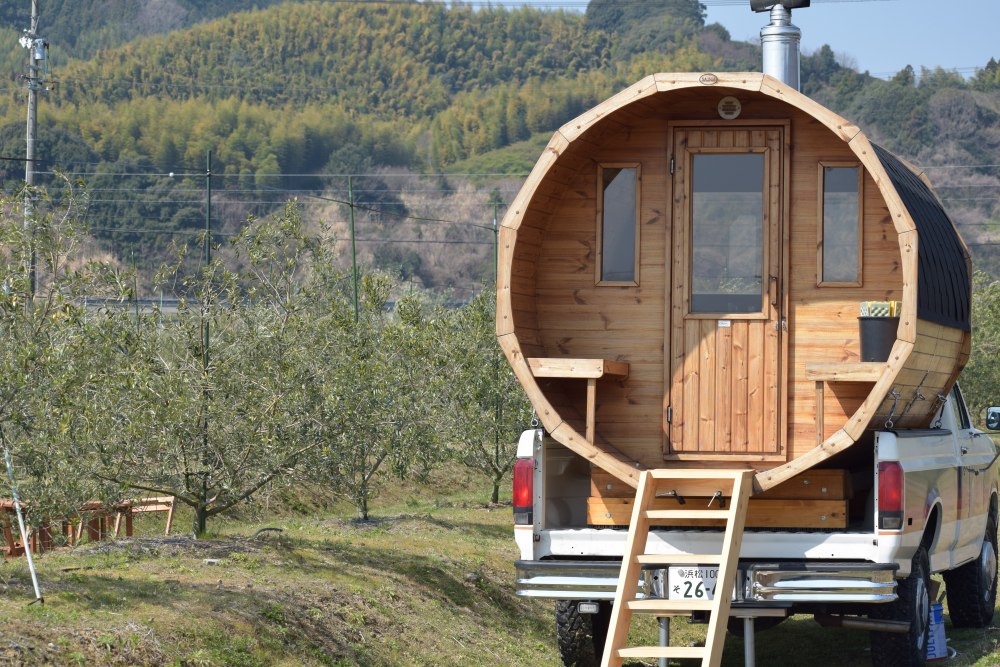 当日は県内のサウナ普及に取り組むエイケン工業様とPEACEFUL GARDEN様のご協力で、テントサウナとフィンランドに古くから伝わるバレルサウナ、サウナには欠かせない水風呂や、オリーブを眺めて「ととのう」インフィニティチェアも設置。バレルサウナはトラックの荷台に設置されているのでどこでもサウナが体験できるようになっています。